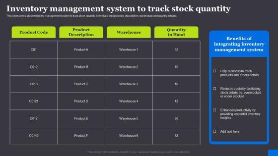 This slide covers stock inventory management system to track stock quantity. It involves product code, description, warehouse and quantity in hand. Make sure to capture your audiences attention in your business displays with our gratis customizable Inventory Management System Maximizing Efficiency With Asset Tracking Solutions Professional Pdf. These are great for business strategies, office conferences, capital raising or task suggestions. If you desire to acquire more customers for your tech business and ensure they stay satisfied, create your own sales presentation with these plain slides. This slide covers stock inventory management system to track stock quantity. It involves product code, description, warehouse and quantity in hand.