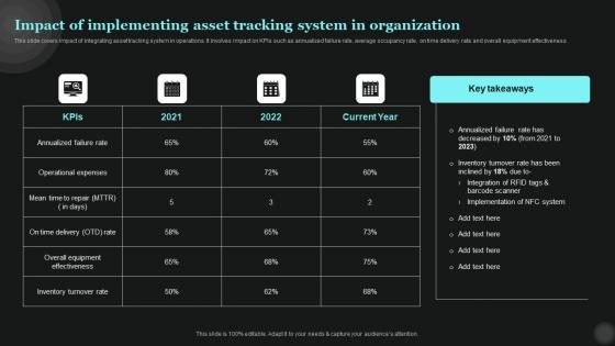 This slide covers impact of integrating asset tracking system in operations. It involves impact on KPIs such as annualized failure rate, average occupancy rate, on time delivery rate and overall equipment effectiveness. If you are looking for a format to display your unique thoughts, then the professionally designed Impact Of Implementing Asset Tracking System RFID Solutions For Asset Traceability Summary Pdf is the one for you. You can use it as a Google Slides template or a PowerPoint template. Incorporate impressive visuals, symbols, images, and other charts. Modify or reorganize the text boxes as you desire. Experiment with shade schemes and font pairings. Alter, share or cooperate with other people on your work. Download Impact Of Implementing Asset Tracking System RFID Solutions For Asset Traceability Summary Pdf and find out how to give a successful presentation. Present a perfect display to your team and make your presentation unforgettable. This slide covers impact of integrating asset tracking system in operations. It involves impact on KPIs such as annualized failure rate, average occupancy rate, on time delivery rate and overall equipment effectiveness.