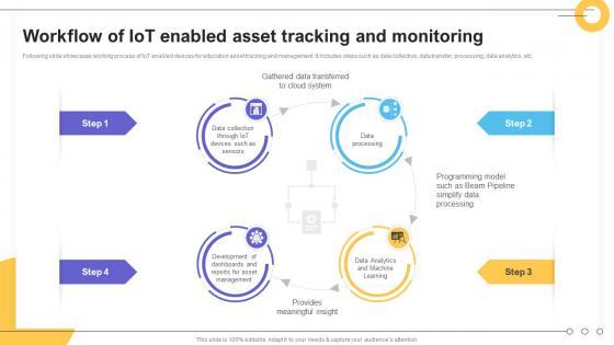 Following slide showcases working process of IoT enabled devices for education asset tracking and management. It includes steps such as data collection, data transfer, processing, data analytics, etc. Whether you have daily or monthly meetings, a brilliant presentation is necessary. Workflow Of IoT Enabled Asset Tracking Impact Of IoT Technology On Education IoT SS V can be your best option for delivering a presentation. Represent everything in detail using Workflow Of IoT Enabled Asset Tracking Impact Of IoT Technology On Education IoT SS V and make yourself stand out in meetings. The template is versatile and follows a structure that will cater to your requirements. All the templates prepared by Slidegeeks are easy to download and edit. Our research experts have taken care of the corporate themes as well. So, give it a try and see the results. Following slide showcases working process of IoT enabled devices for education asset tracking and management. It includes steps such as data collection, data transfer, processing, data analytics, etc.