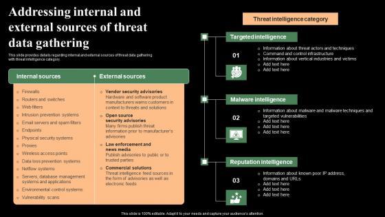 This slide provides details regarding internal and external sources of threat data gathering with threat intelligence category. Here you can discover an assortment of the finest PowerPoint and Google Slides templates. With these templates, you can create presentations for a variety of purposes while simultaneously providing your audience with an eye-catching visual experience. Download Addressing Internal And External Sources Of Threat Data Monitoring Digital Assets Demonstration Pdf to deliver an impeccable presentation. These templates will make your job of preparing presentations much quicker, yet still, maintain a high level of quality. Slidegeeks has experienced researchers who prepare these templates and write high-quality content for you. Later on, you can personalize the content by editing the Addressing Internal And External Sources Of Threat Data Monitoring Digital Assets Demonstration Pdf This slide provides details regarding internal and external sources of threat data gathering with threat intelligence category.