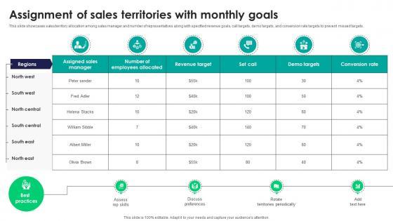 This slide showcases sales territory allocation among sales manager and number of representatives along with specified revenue goals, call targets, demo targets, and conversion rate targets to prevent missed targets. Want to ace your presentation in front of a live audience Our Assignment Of Sales Territories With Monthly Goals Efficient Sales Territory Management To Build SA SS V can help you do that by engaging all the users towards you. Slidegeeks experts have put their efforts and expertise into creating these impeccable powerpoint presentations so that you can communicate your ideas clearly. Moreover, all the templates are customizable, and easy-to-edit and downloadable. Use these for both personal and commercial use. This slide showcases sales territory allocation among sales manager and number of representatives along with specified revenue goals, call targets, demo targets, and conversion rate targets to prevent missed targets.