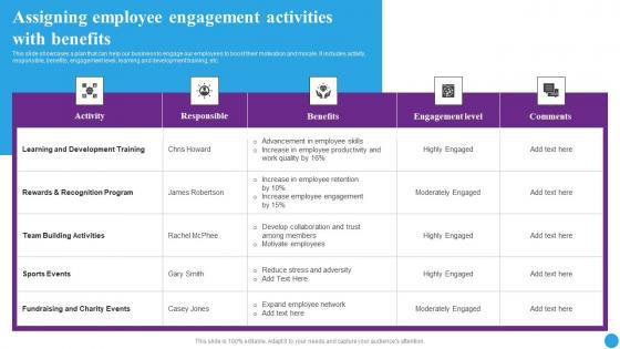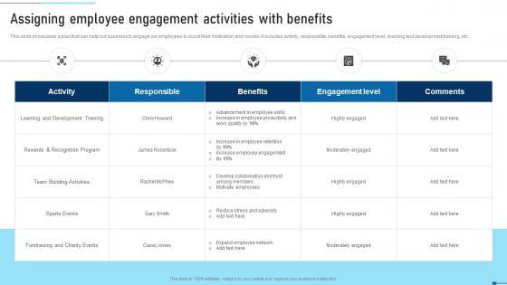 This slide showcases a plan that can help our business to engage our employees to boost their motivation and morale. It includes activity, responsible, benefits, engagement level, learning and development training, etc. Do you know about Slidesgeeks Optimizing Human Capital Alignment Assigning Employee Engagement Activities With Benefits Rules PDF These are perfect for delivering any kind od presentation. Using it, create PowerPoint presentations that communicate your ideas and engage audiences. Save time and effort by using our pre-designed presentation templates that are perfect for a wide range of topic. Our vast selection of designs covers a range of styles, from creative to business, and are all highly customizable and easy to edit. Download as a PowerPoint template or use them as Google Slides themes.