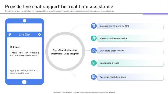 This slide showcases example of live chat support provided to increase conversions, customer retention, client reviews, leads and speed up resolution times. Take your projects to the next level with our ultimate collection of Building Stronger Customer Provide Live Chat Support For Real Time Assistance SA SS V. Slidegeeks has designed a range of layouts that are perfect for representing task or activity duration, keeping track of all your deadlines at a glance. Tailor these designs to your exact needs and give them a truly corporate look with your own brand colors they will make your projects stand out from the rest This slide showcases example of live chat support provided to increase conversions, customer retention, client reviews, leads and speed up resolution times.