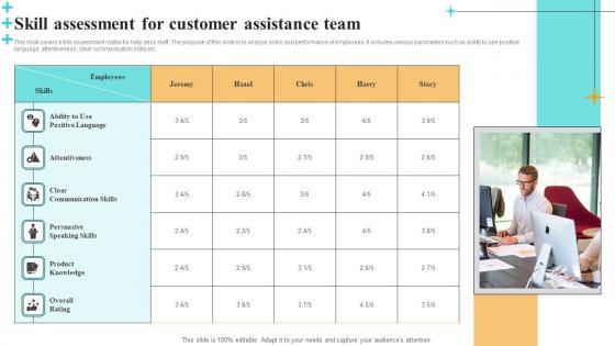 This slide covers skills assessment matrix for help desk staff. The purpose of this slide is to analyze skills and performance of employees. It includes various parameters such as ability to use positive language, attentiveness, clear communication skills etc. Pitch your topic with ease and precision using this Skill Assessment For Customer Assistance Team Introduction Pdf. This layout presents information on Attentiveness, Clear Communication Skills, Persuasive Speaking Skills. It is also available for immediate download and adjustment. So, changes can be made in the color, design, graphics or any other component to create a unique layout. This slide covers skills assessment matrix for help desk staff. The purpose of this slide is to analyze skills and performance of employees. It includes various parameters such as ability to use positive language, attentiveness, clear communication skills etc.