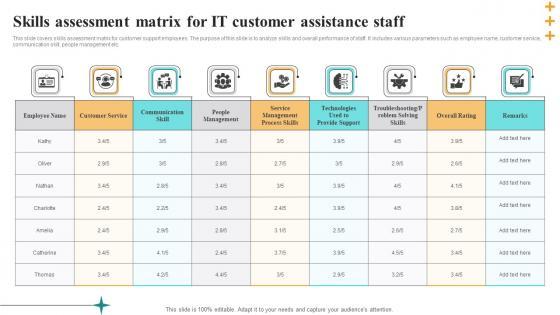 This slide covers skills assessment matrix for customer support employees. The purpose of this slide is to analyze skills and overall performance of staff. It includes various parameters such as employee name, customer service, communication skill, people management etc. Pitch your topic with ease and precision using this Skills Assessment Matrix For IT Customer Assistance Staff Pictures Pdf. This layout presents information on Employee Name, Customer Service, Communication Skill. It is also available for immediate download and adjustment. So, changes can be made in the color, design, graphics or any other component to create a unique layout. This slide covers skills assessment matrix for customer support employees. The purpose of this slide is to analyze skills and overall performance of staff. It includes various parameters such as employee name, customer service, communication skill, people management etc.