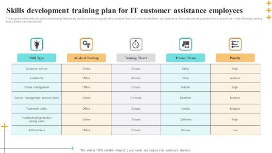 The purpose of this slide is to showcase development training plan for customer support staff to increase levels of customer satisfaction and experience. It includes various parameters such as skill type, mode of training, training hours, trainer name and priority. Showcasing this set of slides titled Skills Development Training Plan For IT Customer Assistance Employees Information Pdf. The topics addressed in these templates are Skill Type, Mode Of Training, Training Hours. All the content presented in this PPT design is completely editable. Download it and make adjustments in color, background, font etc. as per your unique business setting. The purpose of this slide is to showcase development training plan for customer support staff to increase levels of customer satisfaction and experience. It includes various parameters such as skill type, mode of training, training hours, trainer name and priority.