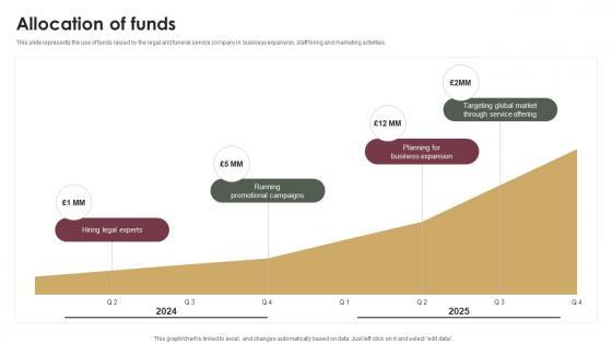 This slide represents the use of funds raised by the legal and funeral service company in business expansion, staff hiring and marketing activities.Find a pre-designed and impeccable Allocation Of Funds Probate Assistance Solutions Company Investor Funding Elevator Pitch Deck. The templates can ace your presentation without additional effort. You can download these easy-to-edit presentation templates to make your presentation stand out from others. So, what are you waiting for Download the template from Slidegeeks today and give a unique touch to your presentation. This slide represents the use of funds raised by the legal and funeral service company in business expansion, staff hiring and marketing activities.