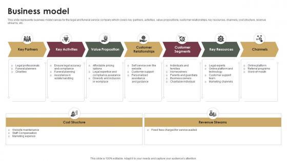 This slide represents business model canvas for the legal and funeral service company which covers key partners, activities, value propositions, customer relationships, key resources, channels, cost structure, revenue streams, etc.Boost your pitch with our creative Business Model Probate Assistance Solutions Company Investor Funding Elevator Pitch Deck. Deliver an awe-inspiring pitch that will mesmerize everyone. Using these presentation templates you will surely catch everyones attention. You can browse the ppts collection on our website. We have researchers who are experts at creating the right content for the templates. So you do not have to invest time in any additional work. Just grab the template now and use them. This slide represents business model canvas for the legal and funeral service company which covers key partners, activities, value propositions, customer relationships, key resources, channels, cost structure, revenue streams, etc.