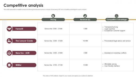 This slide represents competitor analysis for the legal and funeral service company showcasing USP and competitive advantage for each company.Want to ace your presentation in front of a live audience Our Competitive Analysis Probate Assistance Solutions Company Investor Funding Elevator Pitch Deck can help you do that by engaging all the users towards you. Slidegeeks experts have put their efforts and expertise into creating these impeccable powerpoint presentations so that you can communicate your ideas clearly. Moreover, all the templates are customizable, and easy-to-edit and downloadable. Use these for both personal and commercial use. This slide represents competitor analysis for the legal and funeral service company showcasing USP and competitive advantage for each company.