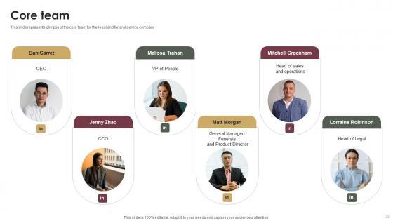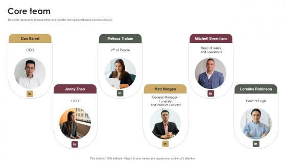 This slide represents glimpse of the core team for the legal and funeral service companyThere are so many reasons you need a Core Team Probate Assistance Solutions Company Investor Funding Elevator Pitch Deck. The first reason is you can not spend time making everything from scratch, Thus, Slidegeeks has made presentation templates for you too. You can easily download these templates from our website easily. This slide represents glimpse of the core team for the legal and funeral service company