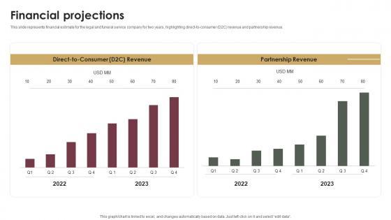 This slide represents financial estimate for the legal and funeral service company for two years, highlighting direct-to-consumer D2C revenue and partnership revenue.Present like a pro with Financial Projections Probate Assistance Solutions Company Investor Funding Elevator Pitch Deck. Create beautiful presentations together with your team, using our easy-to-use presentation slides. Share your ideas in real-time and make changes on the fly by downloading our templates. So whether you are in the office, on the go, or in a remote location, you can stay in sync with your team and present your ideas with confidence. With Slidegeeks presentation got a whole lot easier. Grab these presentations today. This slide represents financial estimate for the legal and funeral service company for two years, highlighting direct-to-consumer D2C revenue and partnership revenue.