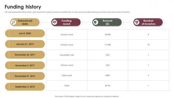 This slide represents funding rounds grant, seed round, venture round and convertible note. It covers announced date, funding round, total amount, and number of investors.Slidegeeks is here to make your presentations a breeze with Funding History Probate Assistance Solutions Company Investor Funding Elevator Pitch Deck With our easy-to-use and customizable templates, you can focus on delivering your ideas rather than worrying about formatting. With a variety of designs to choose from, you are sure to find one that suits your needs. And with animations and unique photos, illustrations, and fonts, you can make your presentation pop. So whether you are giving a sales pitch or presenting to the board, make sure to check out Slidegeeks first This slide represents funding rounds grant, seed round, venture round and convertible note. It covers announced date, funding round, total amount, and number of investors.