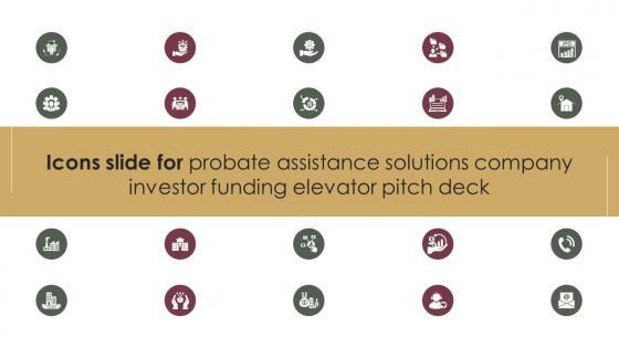 Introducing our well designed Icons Slide For Probate Assistance Solutions Company Investor Funding Elevator Pitch Deck set of slides. The slide displays editable icons to enhance your visual presentation. The icons can be edited easily. So customize according to your business to achieve a creative edge. Download and share it with your audience. Our Icons Slide For Probate Assistance Solutions Company Investor Funding Elevator Pitch Deck are topically designed to provide an attractive backdrop to any subject. Use them to look like a presentation pro.