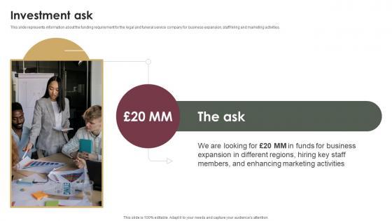 This slide represents information about the funding requirement for the legal and funeral service company for business expansion, staff hiring and marketing activities.Whether you have daily or monthly meetings, a brilliant presentation is necessary. Investment Ask Probate Assistance Solutions Company Investor Funding Elevator Pitch Deck can be your best option for delivering a presentation. Represent everything in detail using Investment Ask Probate Assistance Solutions Company Investor Funding Elevator Pitch Deck and make yourself stand out in meetings. The template is versatile and follows a structure that will cater to your requirements. All the templates prepared by Slidegeeks are easy to download and edit. Our research experts have taken care of the corporate themes as well. So, give it a try and see the results. This slide represents information about the funding requirement for the legal and funeral service company for business expansion, staff hiring and marketing activities.