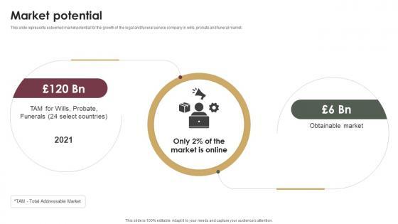 This slide represents esteemed market potential for the growth of the legal and funeral service company in wills, probate and funeral market. If you are looking for a format to display your unique thoughts, then the professionally designed Market Potential Probate Assistance Solutions Company Investor Funding Elevator Pitch Deck is the one for you. You can use it as a Google Slides template or a PowerPoint template. Incorporate impressive visuals, symbols, images, and other charts. Modify or reorganize the text boxes as you desire. Experiment with shade schemes and font pairings. Alter, share or cooperate with other people on your work. Download Market Potential Probate Assistance Solutions Company Investor Funding Elevator Pitch Deck and find out how to give a successful presentation. Present a perfect display to your team and make your presentation unforgettable. This slide represents esteemed market potential for the growth of the legal and funeral service company in wills, probate and funeral market.