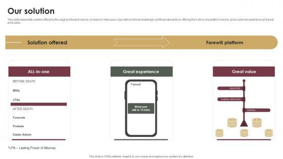 This slide represents solution offered by the legal and funeral service company to help users cope with emotional challenges and financial events by offering them all-in-one platform service, good customer experience and great price value.Crafting an eye-catching presentation has never been more straightforward. Let your presentation shine with this tasteful yet straightforward Our Solution Probate Assistance Solutions Company Investor Funding Elevator Pitch Deck template. It offers a minimalistic and classy look that is great for making a statement. The colors have been employed intelligently to add a bit of playfulness while still remaining professional. Construct the ideal Our Solution Probate Assistance Solutions Company Investor Funding Elevator Pitch Deck that effortlessly grabs the attention of your audience Begin now and be certain to wow your customers This slide represents solution offered by the legal and funeral service company to help users cope with emotional challenges and financial events by offering them all-in-one platform service, good customer experience and great price value.