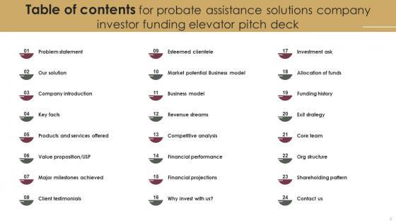 This Table Of Contents For Probate Assistance Solutions Company Investor Funding Elevator Pitch Deck is perfect for any presentation, be it in front of clients or colleagues. It is a versatile and stylish solution for organizing your meetings. The Table Of Contents For Probate Assistance Solutions Company Investor Funding Elevator Pitch Deck features a modern design for your presentation meetings. The adjustable and customizable slides provide unlimited possibilities for acing up your presentation. Slidegeeks has done all the homework before launching the product for you. So, do not wait, grab the presentation templates today Our Table Of Contents For Probate Assistance Solutions Company Investor Funding Elevator Pitch Deck are topically designed to provide an attractive backdrop to any subject. Use them to look like a presentation pro.
