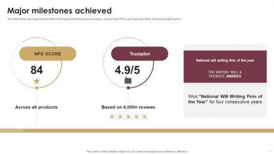 This slide represents major achievements for the legal and funeral service company, such as high NPS score, high user rating, wills and probate awards.If your project calls for a presentation, then Slidegeeks is your go-to partner because we have professionally designed, easy-to-edit templates that are perfect for any presentation. After downloading, you can easily edit Major Milestones Achieved Probate Assistance Solutions Company Investor Funding Elevator Pitch Deck and make the changes accordingly. You can rearrange slides or fill them with different images. Check out all the handy templates This slide represents major achievements for the legal and funeral service company, such as high NPS score, high user rating, wills and probate awards.