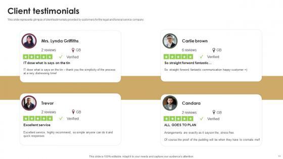This slide represents glimpse of client testimonials provided by customers for the legal and funeral service company. Create an editable Client Testimonials Probate Assistance Solutions Company Investor Funding Elevator Pitch Deck that communicates your idea and engages your audience. Whether you are presenting a business or an educational presentation, pre-designed presentation templates help save time. Client Testimonials Probate Assistance Solutions Company Investor Funding Elevator Pitch Deck is highly customizable and very easy to edit, covering many different styles from creative to business presentations. Slidegeeks has creative team members who have crafted amazing templates. So, go and get them without any delay. This slide represents glimpse of client testimonials provided by customers for the legal and funeral service company.