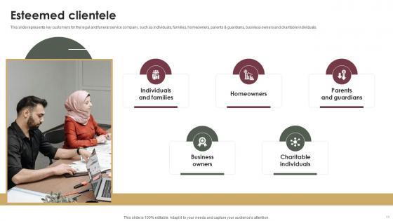 This slide represents key customers for the legal and funeral service company, such as individuals, families, homeowners, parents and guardians, business owners and charitable individuals.Do you have to make sure that everyone on your team knows about any specific topic I yes, then you should give Esteemed Clientele Probate Assistance Solutions Company Investor Funding Elevator Pitch Deck a try. Our experts have put a lot of knowledge and effort into creating this impeccable Esteemed Clientele Probate Assistance Solutions Company Investor Funding Elevator Pitch Deck. You can use this template for your upcoming presentations, as the slides are perfect to represent even the tiniest detail. You can download these templates from the Slidegeeks website and these are easy to edit. So grab these today This slide represents key customers for the legal and funeral service company, such as individuals, families, homeowners, parents and guardians, business owners and charitable individuals.
