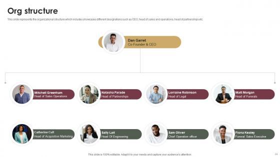 This slide represents the organizational structure which includes showcases different designations such as CEO, head of sales and operations, head of partnerships etc.Are you in need of a template that can accommodate all of your creative concepts This one is crafted professionally and can be altered to fit any style. Use it with Google Slides or PowerPoint. Include striking photographs, symbols, depictions, and other visuals. Fill, move around, or remove text boxes as desired. Test out color palettes and font mixtures. Edit and save your work, or work with colleagues. Download Org Structure Probate Assistance Solutions Company Investor Funding Elevator Pitch Deck and observe how to make your presentation outstanding. Give an impeccable presentation to your group and make your presentation unforgettable. This slide represents the organizational structure which includes showcases different designations such as CEO, head of sales and operations, head of partnerships etc.