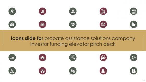 Use this Probate Assistance Solutions Company Investor Funding Elevator Pitch Deck Ppt Template to ensure the business world gets to know you as a presentation expert with tremendous recall value. With its focus on providing the worlds best designs to highlight business ideas that have the potential to change the world, this PPT Template is sure to win you clients. The complete deck in thirty eight slides is a compendium of information, structured in a manner that provides the best framework for a presentation. Use this completely editable and customizable presentation to make an impact and improve your order book. Download now. Our Probate Assistance Solutions Company Investor Funding Elevator Pitch Deck Ppt Template are topically designed to provide an attractive backdrop to any subject. Use them to look like a presentation pro.