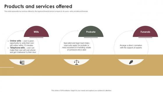 This slide represents key services offered by the legal and funeral service company to its users wills, probate and funerals.Formulating a presentation can take up a lot of effort and time, so the content and message should always be the primary focus. The visuals of the PowerPoint can enhance the presenters message, so our Products And Services Offered Probate Assistance Solutions Company Investor Funding Elevator Pitch Deck was created to help save time. Instead of worrying about the design, the presenter can concentrate on the message while our designers work on creating the ideal templates for whatever situation is needed. Slidegeeks has experts for everything from amazing designs to valuable content, we have put everything into Products And Services Offered Probate Assistance Solutions Company Investor Funding Elevator Pitch Deck. This slide represents key services offered by the legal and funeral service company to its users wills, probate and funerals.