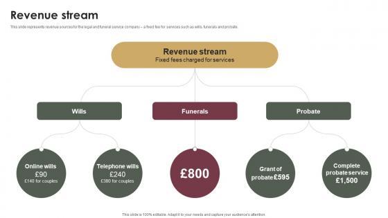 This slide represents revenue sources for the legal and funeral service company a fixed fee for services such as wills, funerals and probate.Coming up with a presentation necessitates that the majority of the effort goes into the content and the message you intend to convey. The visuals of a PowerPoint presentation can only be effective if it supplements and supports the story that is being told. Keeping this in mind our experts created Revenue Stream Probate Assistance Solutions Company Investor Funding Elevator Pitch Deck to reduce the time that goes into designing the presentation. This way, you can concentrate on the message while our designers take care of providing you with the right template for the situation. This slide represents revenue sources for the legal and funeral service company a fixed fee for services such as wills, funerals and probate.