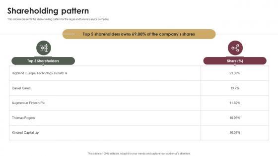 This slide represents the shareholding pattern for the legal and funeral service company. This modern and well-arranged Shareholding Pattern Probate Assistance Solutions Company Investor Funding Elevator Pitch Deck provides lots of creative possibilities. It is very simple to customize and edit with the Powerpoint Software. Just drag and drop your pictures into the shapes. All facets of this template can be edited with Powerpoint, no extra software is necessary. Add your own material, put your images in the places assigned for them, adjust the colors, and then you can show your slides to the world, with an animated slide included. This slide represents the shareholding pattern for the legal and funeral service company.