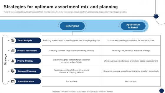 This slide showcases a strategy for optimized assortment mix and planning. It includes trend analysis, product assortment, pricing strategy, seasonal planning and space allocation.Slidegeeks has constructed Strategies For Optimum Assortment Mix And Planning DT SS V after conducting extensive research and examination. These presentation templates are constantly being generated and modified based on user preferences and critiques from editors. Here, you will find the most attractive templates for a range of purposes while taking into account ratings and remarks from users regarding the content. This is an excellent jumping-off point to explore our content and will give new users an insight into our top-notch PowerPoint Templates. This slide showcases a strategy for optimized assortment mix and planning. It includes trend analysis, product assortment, pricing strategy, seasonal planning and space allocation.