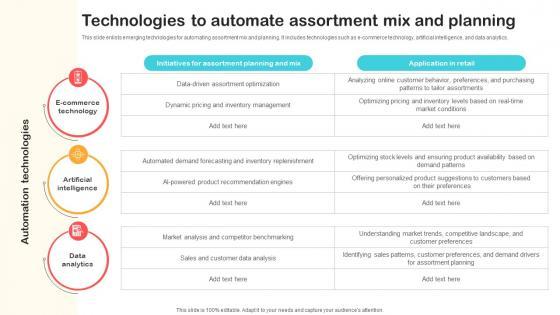 This slide enlists emerging technologies for automating assortment mix and planning. It includes technologies such as e-commerce technology, artificial intelligence, and data analytics. Take your projects to the next level with our ultimate collection of Technologies To Automate Assortment Mix And Planning DT SS V. Slidegeeks has designed a range of layouts that are perfect for representing task or activity duration, keeping track of all your deadlines at a glance. Tailor these designs to your exact needs and give them a truly corporate look with your own brand colors they will make your projects stand out from the rest This slide enlists emerging technologies for automating assortment mix and planning. It includes technologies such as e-commerce technology, artificial intelligence, and data analytics.