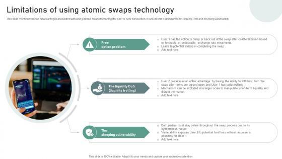 This slide mentions various disadvantages associated with using atomic swaps technology for peer to peer transaction. It includes free option problem, liquidity DoS and sleeping vulnerability. Retrieve professionally designed Seamless Integration The Power Limitations Of Using Atomic Swaps Technology BCT SS V to effectively convey your message and captivate your listeners. Save time by selecting pre-made slideshows that are appropriate for various topics, from business to educational purposes. These themes come in many different styles, from creative to corporate, and all of them are easily adjustable and can be edited quickly. Access them as PowerPoint templates or as Google Slides themes. You do not have to go on a hunt for the perfect presentation because Slidegeeks got you covered from everywhere. This slide mentions various disadvantages associated with using atomic swaps technology for peer to peer transaction. It includes free option problem, liquidity DoS and sleeping vulnerability.