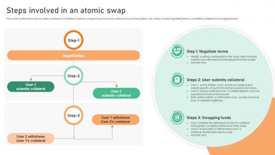 This slide mentions the various steps involved in completion of atomic swap process to ensure safe peer to peer transaction. Key steps include negotiating terms, submitting collateral and swapping funds. Do you have to make sure that everyone on your team knows about any specific topic I yes, then you should give Understanding Various Blockchain Steps Involved In An Atomic Swap BCT SS V a try. Our experts have put a lot of knowledge and effort into creating this impeccable Understanding Various Blockchain Steps Involved In An Atomic Swap BCT SS V. You can use this template for your upcoming presentations, as the slides are perfect to represent even the tiniest detail. You can download these templates from the Slidegeeks website and these are easy to edit. So grab these today This slide mentions the various steps involved in completion of atomic swap process to ensure safe peer to peer transaction. Key steps include negotiating terms, submitting collateral and swapping funds.
