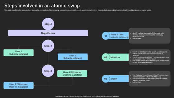This slide mentions the various steps involved in completion of atomic swap process to ensure safe peer to peer transaction. Key steps include negotiating terms, submitting collateral and swapping funds. Want to ace your presentation in front of a live audience Our Bridging Blockchains A Deep Steps Involved In An Atomic Swap BCT SS V can help you do that by engaging all the users towards you. Slidegeeks experts have put their efforts and expertise into creating these impeccable powerpoint presentations so that you can communicate your ideas clearly. Moreover, all the templates are customizable, and easy-to-edit and downloadable. Use these for both personal and commercial use. This slide mentions the various steps involved in completion of atomic swap process to ensure safe peer to peer transaction. Key steps include negotiating terms, submitting collateral and swapping funds.