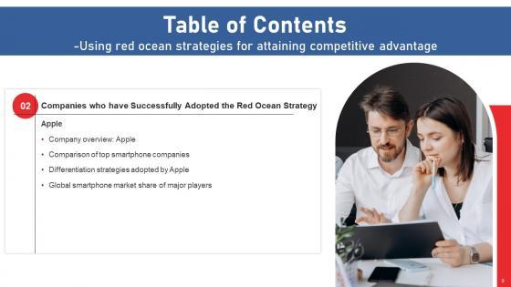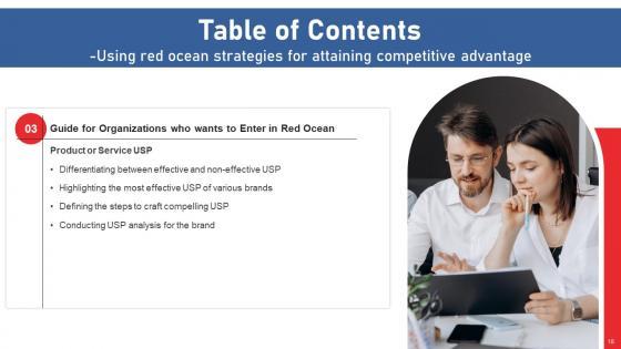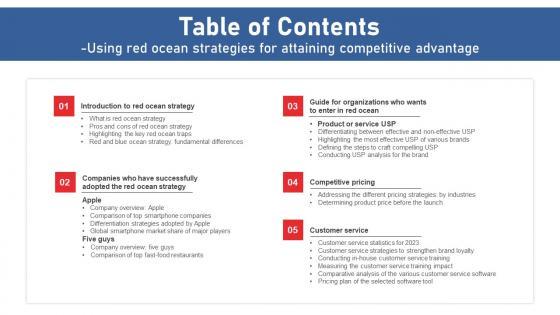 The best PPT templates are a great way to save time, energy, and resources. Slidegeeks have 100 percent editable powerpoint slides making them incredibly versatile. With these quality presentation templates, you can create a captivating and memorable presentation by combining visually appealing slides and effectively communicating your message. Download Table Of Contents Using Red Ocean Strategies For Attaining Competitive Advantage Demonstration Pdf from Slidegeeks and deliver a wonderful presentation. Our Table Of Contents Using Red Ocean Strategies For Attaining Competitive Advantage Demonstration Pdf are topically designed to provide an attractive backdrop to any subject. Use them to look like a presentation pro.