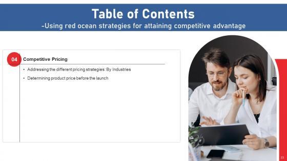 With well-researched insights and carefully-constructed design, this Using Red Ocean Strategies For Attaining Competitive Advantage Complete Deck is all that you need for your next business meeting with clients and win them over. Add your data to graphs, charts, and tables that are already ready to display it with stunning visuals and help your audience recall your work. With this PPT Complete Deck, you will be able to display your knowledge of the subject as well as your skills as a communicator. Share your ideas and make an impact on the audience with this PowerPoint Layout and ensure that you are known as a presentation professional. Download this PPT Template Bundle to create the most interesting presentation anyone has ever seen. Our Using Red Ocean Strategies For Attaining Competitive Advantage Complete Deck are topically designed to provide an attractive backdrop to any subject. Use them to look like a presentation pro.