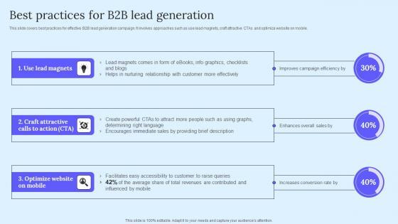 This slide covers best practices for effective B2B lead generation campaign. It involves approaches such as use lead magnets, craft attractive CTAs and optimize website on mobile. Whether you have daily or monthly meetings, a brilliant presentation is necessary. Best Practices B2B Lead Generation B2B Marketing Techniques To Attract Potential Information Pdf can be your best option for delivering a presentation. Represent everything in detail using Best Practices B2B Lead Generation B2B Marketing Techniques To Attract Potential Information Pdf and make yourself stand out in meetings. The template is versatile and follows a structure that will cater to your requirements. All the templates prepared by Slidegeeks are easy to download and edit. Our research experts have taken care of the corporate themes as well. So, give it a try and see the results. This slide covers best practices for effective B2B lead generation campaign. It involves approaches such as use lead magnets, craft attractive CTAs and optimize website on mobile.