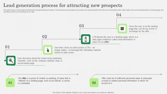This slide covers 4 major steps involved in the lead generation procedure. The includes process stages such as the user discovering the brand, the user clicking the call to action option, the user being directed to a landing page, and user filling out forms in exchange for an offer. Find a pre designed and impeccable Lead Generation Process For Attracting New Prospects Improving Lead Generation Process Pictures PDF. The templates can ace your presentation without additional effort. You can download these easy to edit presentation templates to make your presentation stand out from others. So, what are you waiting for Download the template from Slidegeeks today and give a unique touch to your presentation.