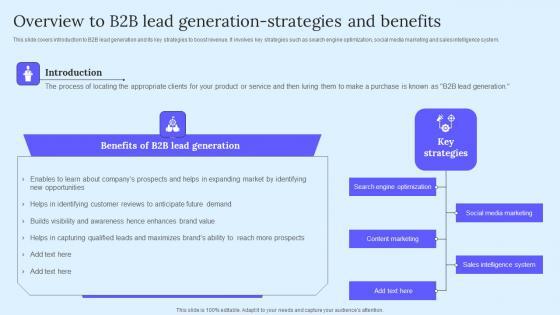 This slide covers introduction to B2B lead generation and its key strategies to boost revenue. It involves key strategies such as search engine optimization, social media marketing and sales intelligence system. Boost your pitch with our creative Overview To B2B Lead Generation B2B Marketing Techniques To Attract Potential Professional Pdf. Deliver an awe inspiring pitch that will mesmerize everyone. Using these presentation templates you will surely catch everyones attention. You can browse the ppts collection on our website. We have researchers who are experts at creating the right content for the templates. So you do not have to invest time in any additional work. Just grab the template now and use them. This slide covers introduction to B2B lead generation and its key strategies to boost revenue. It involves key strategies such as search engine optimization, social media marketing and sales intelligence system.