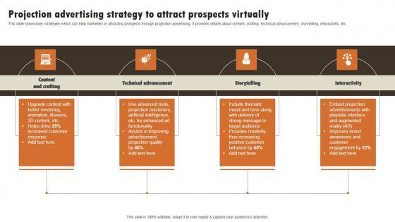 This slide showcases strategies which can help marketers in attracting prospects through projection advertising. It provides details about content, crafting, technical advancement, storytelling, interactivity, etc. Do you have to make sure that everyone on your team knows about any specific topic I yes, then you should give Projection Advertising Strategy To Attract Prospects Virtually Ppt Summary Example Introduction PDF a try. Our experts have put a lot of knowledge and effort into creating this impeccable Projection Advertising Strategy To Attract Prospects Virtually Ppt Summary Example Introduction PDF. You can use this template for your upcoming presentations, as the slides are perfect to represent even the tiniest detail. You can download these templates from the Slidegeeks website and these are easy to edit. So grab these today This slide showcases strategies which can help marketers in attracting prospects through projection advertising. It provides details about content, crafting, technical advancement, storytelling, interactivity, etc.