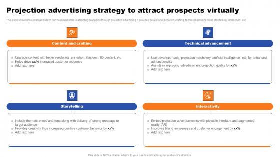 This slide showcases strategies which can help marketers in attracting prospects through projection advertising. It provides details about content, crafting, technical advancement, storytelling, interactivity, etc.If you are looking for a format to display your unique thoughts, then the professionally designed Implementing Experimental Marketing Projection Advertising Strategy To Attract Prospects Virtually Microsoft PDF is the one for you. You can use it as a Google Slides template or a PowerPoint template. Incorporate impressive visuals, symbols, images, and other charts. Modify or reorganize the text boxes as you desire. Experiment with shade schemes and font pairings. Alter, share or cooperate with other people on your work. Download Implementing Experimental Marketing Projection Advertising Strategy To Attract Prospects Virtually Microsoft PDF and find out how to give a successful presentation. Present a perfect display to your team and make your presentation unforgettable.