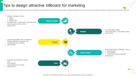 This slide shows various tips which can be used by organizations while designing a billboard to place it in public and attract potential customers. These tips are keep billboard simple, use bright colors, high quality images, etc. Slidegeeks is here to make your presentations a breeze with One On One Advertising Tips To Design Attractive Billboard For Marketing Strategy SS V With our easy-to-use and customizable templates, you can focus on delivering your ideas rather than worrying about formatting. With a variety of designs to choose from, you are sure to find one that suits your needs. And with animations and unique photos, illustrations, and fonts, you can make your presentation pop. So whether you are giving a sales pitch or presenting to the board, make sure to check out Slidegeeks first This slide shows various tips which can be used by organizations while designing a billboard to place it in public and attract potential customers. These tips are keep billboard simple, use bright colors, high quality images, etc.