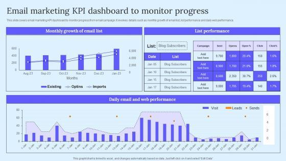 This slide covers email marketing KPI dashboard to monitor progress from email campaign. It involves details such as monthly growth of email list, list performance and daily web performance. Coming up with a presentation necessitates that the majority of the effort goes into the content and the message you intend to convey. The visuals of a PowerPoint presentation can only be effective if it supplements and supports the story that is being told. Keeping this in mind our experts created Email Marketing KPI Dashboard B2B Marketing Techniques To Attract Potential Professional Pdf to reduce the time that goes into designing the presentation. This way, you can concentrate on the message while our designers take care of providing you with the right template for the situation. This slide covers email marketing KPI dashboard to monitor progress from email campaign. It involves details such as monthly growth of email list, list performance and daily web performance.