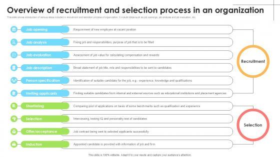 This slide shows introduction of various steps included in recruitment and selection process of organization. It include steps such as job openings, job analysis and job evaluation, etc. Welcome to our selection of the Overview Of Recruitment And Selection Employee Attraction And Competency Ppt Template. These are designed to help you showcase your creativity and bring your sphere to life. Planning and Innovation are essential for any business that is just starting out. This collection contains the designs that you need for your everyday presentations. All of our PowerPoints are 100Percent editable, so you can customize them to suit your needs. This multi-purpose template can be used in various situations. Grab these presentation templates today. This slide shows introduction of various steps included in recruitment and selection process of organization. It include steps such as job openings, job analysis and job evaluation, etc.