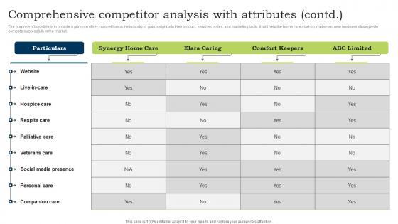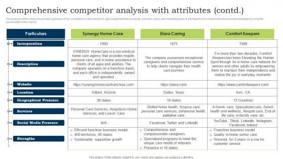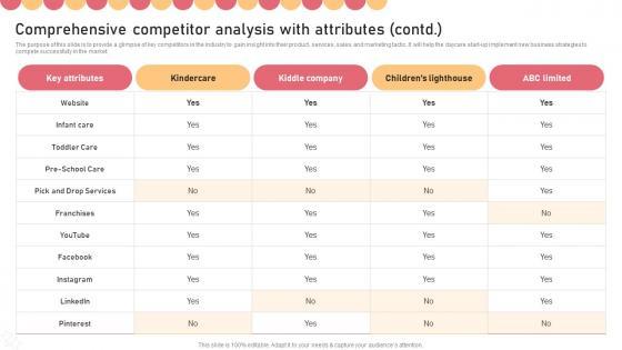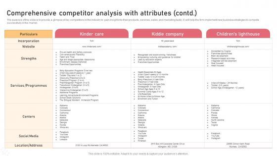The purpose of this slide is to provide a glimpse of key competitors in the industry to gain insight into their products, services, sales, and marketing tactic. It will help the firm implement new business strategies to compete successfully in the market. Want to ace your presentation in front of a live audience Our Comprehensive Competitor Analysis With Attributes Contd Childcare Business Plan Demonstration Pdf can help you do that by engaging all the users towards you. Slidegeeks experts have put their efforts and expertise into creating these impeccable powerpoint presentations so that you can communicate your ideas clearly. Moreover, all the templates are customizable, and easy-to-edit and downloadable. Use these for both personal and commercial use. The purpose of this slide is to provide a glimpse of key competitors in the industry to gain insight into their products, services, sales, and marketing tactic. It will help the firm implement new business strategies to compete successfully in the market.