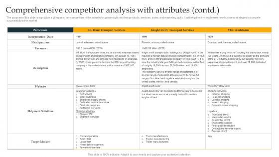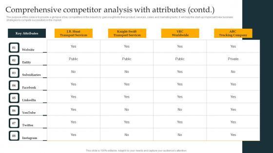 The purpose of this slide is to provide a glimpse of key competitors in the industry to gain insight into their products, services, sales, and marketing tactic. It will help the firm implement new business strategies to compete successfully in the market.Want to ace your presentation in front of a live audience Our Comprehensive Competitor Analysis With Attributes Freight Trucking Business Plan Professional Pdf can help you do that by engaging all the users towards you.. Slidegeeks experts have put their efforts and expertise into creating these impeccable powerpoint presentations so that you can communicate your ideas clearly. Moreover, all the templates are customizable, and easy-to-edit and downloadable. Use these for both personal and commercial use. The purpose of this slide is to provide a glimpse of key competitors in the industry to gain insight into their products, services, sales, and marketing tactic. It will help the firm implement new business strategies to compete successfully in the market.
