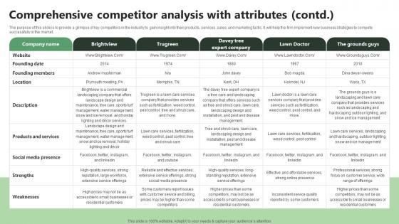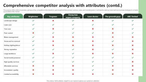 The purpose of this slide is to provide a glimpse of key competitors in the industry to gain insight into their products, services, sales, and marketing tactic. It will help the firm implement new business strategies to compete successfully in the market. Want to ace your presentation in front of a live audience Our Comprehensive Competitor Analysis With Attributes Lawn Care BP SS V can help you do that by engaging all the users towards you. Slidegeeks experts have put their efforts and expertise into creating these impeccable powerpoint presentations so that you can communicate your ideas clearly. Moreover, all the templates are customizable, and easy-to-edit and downloadable. Use these for both personal and commercial use. The purpose of this slide is to provide a glimpse of key competitors in the industry to gain insight into their products, services, sales, and marketing tactic. It will help the firm implement new business strategies to compete successfully in the market.