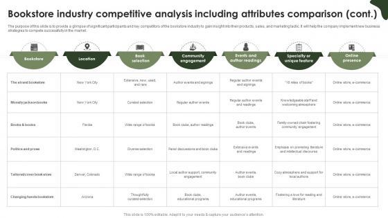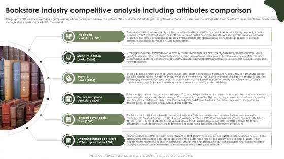 The purpose of this slide is to provide a glimpse of significant participants and key competitors of the bookstore industry to gain insight into their products, sales, and marketing tactic. It will help the company implement new business strategies to compete successfully in the market. Do you have to make sure that everyone on your team knows about any specific topic I yes, then you should give Online Bookstore Business Plan Bookstore Industry Competitive Analysis Including Attributes BP SS V a try. Our experts have put a lot of knowledge and effort into creating this impeccable Online Bookstore Business Plan Bookstore Industry Competitive Analysis Including Attributes BP SS V. You can use this template for your upcoming presentations, as the slides are perfect to represent even the tiniest detail. You can download these templates from the Slidegeeks website and these are easy to edit. So grab these today The purpose of this slide is to provide a glimpse of significant participants and key competitors of the bookstore industry to gain insight into their products, sales, and marketing tactic. It will help the company implement new business strategies to compete successfully in the market.