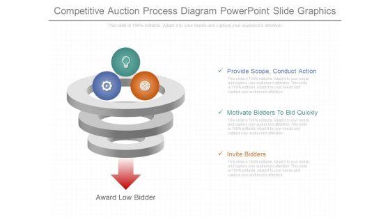 This is a competitive auction process diagram powerpoint slide graphics. This is a three stage process. The stages in this process are provide scope conduct action, motivate bidders to bid quickly, invite bidders.