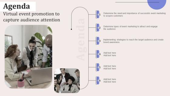 Create an editable Agenda Virtual Event Promotion To Capture Audience Attention Topics Pdf that communicates your idea and engages your audience. Whether you are presenting a business or an educational presentation, pre-designed presentation templates help save time. Agenda Virtual Event Promotion To Capture Audience Attention Topics Pdf is highly customizable and very easy to edit, covering many different styles from creative to business presentations. Slidegeeks has creative team members who have crafted amazing templates. So, go and get them without any delay. Our Agenda Virtual Event Promotion To Capture Audience Attention Topics Pdf are topically designed to provide an attractive backdrop to any subject. Use them to look like a presentation pro.